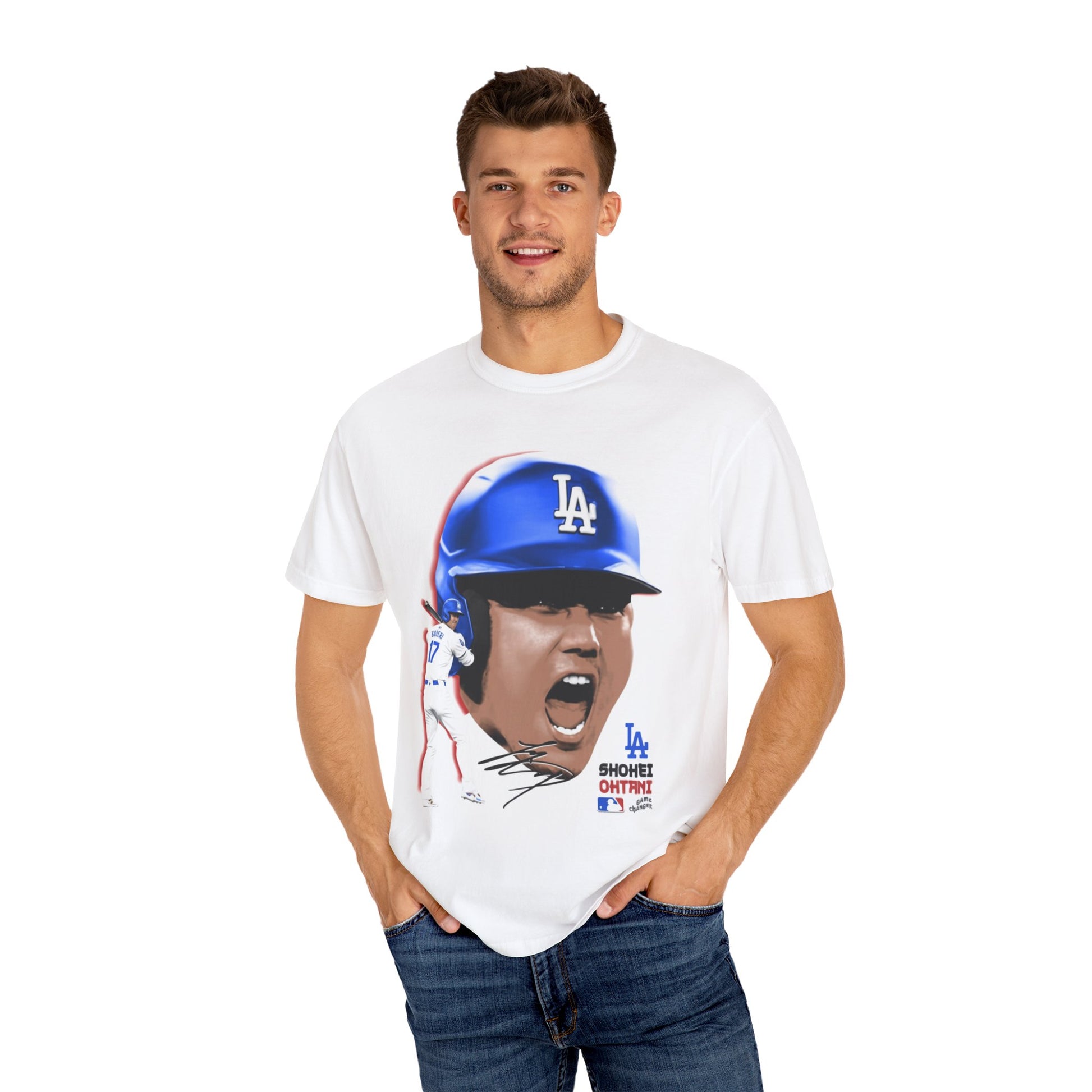 A soft, garment-dyed tee with a bold, joyful portrait print that feels lived-in from the first wear. The relaxed fit and medium-weight 100% ring-spun cotton drape comfortably while the garment-dye process gives the color depth and a worn-in softness that softens with every wash. The front showcases a high-contrast illustration-style image with vibrant gold and black jacket details and an expressive, laughing face partially covered by a rhinestone glove—an energetic design that reads like a snapshot of playful showmanship. Wear it to casual nights out, music-friendly gatherings, or whenever you want an easy statement layer that feels personal rather than flashy. Built to last with double-needle stitching and a tubular knit for a clean silhouette, this tee balances bold graphics with everyday comfort.